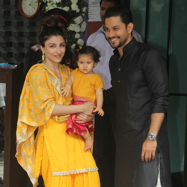 Soha Ali Khan spent her time with husband Kunal Kemmu and her child at Arpita Khan Sharma. They were lovely and gave us the warmest feeling. The mother and daughter both chose a bright yellow style for their clothes. Soha wore yellow outfit while Inaaya wore ghagra choli. Kunal looked good with a choice of black suit.